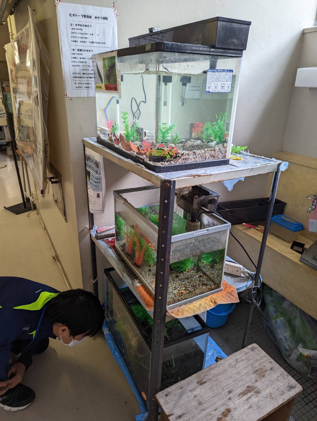 今年もビオトープ委員会へ来年の鑑賞会用のホタルの幼虫の受け渡しが無事に終わりました。委員会の大事なお仕事として、お願いしていますが下の写真のように年々設備が良くなっているように思います。
