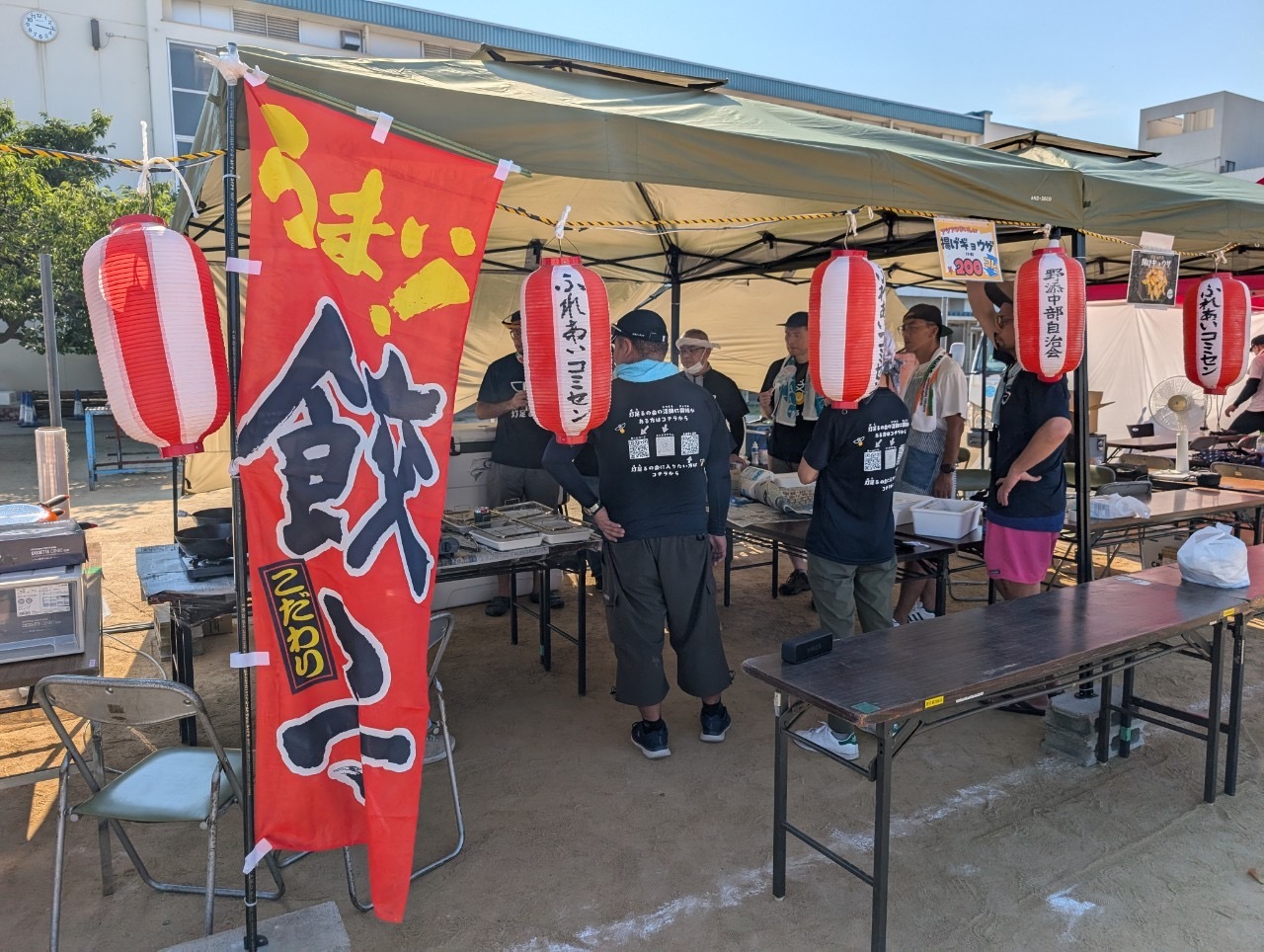 会場は播磨町立蓮池小学校の運動場、暑い日が続いていたので前日夕方のうちにテントを設営し、その前日のテント張りに、祭りに参加しない親父も手伝いに来てくれました。