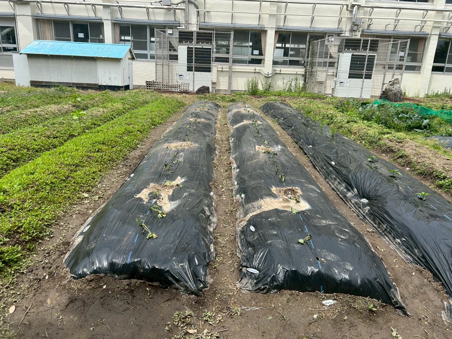 今日はいよいよ苗植えで、子供達が等間隔にマルチシートに穴を開け、苗を植えました。