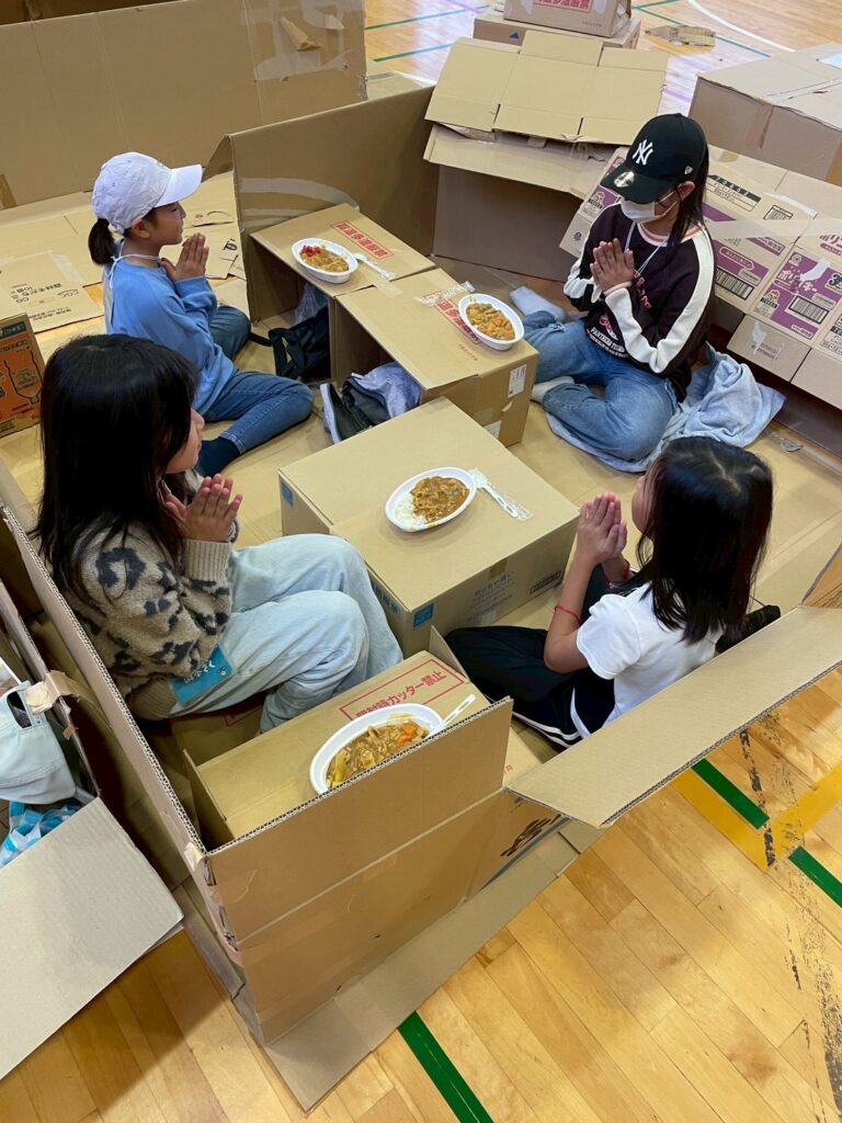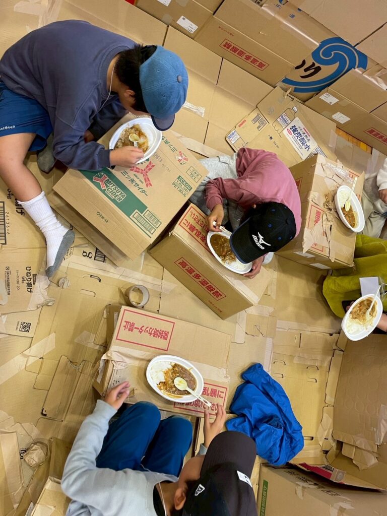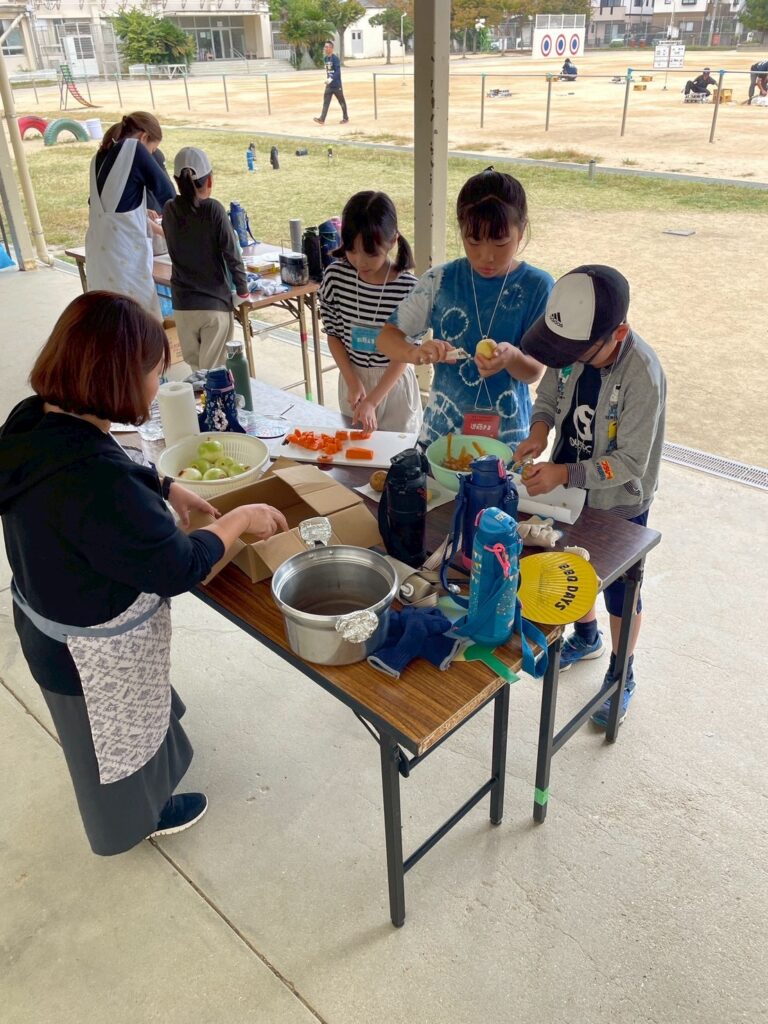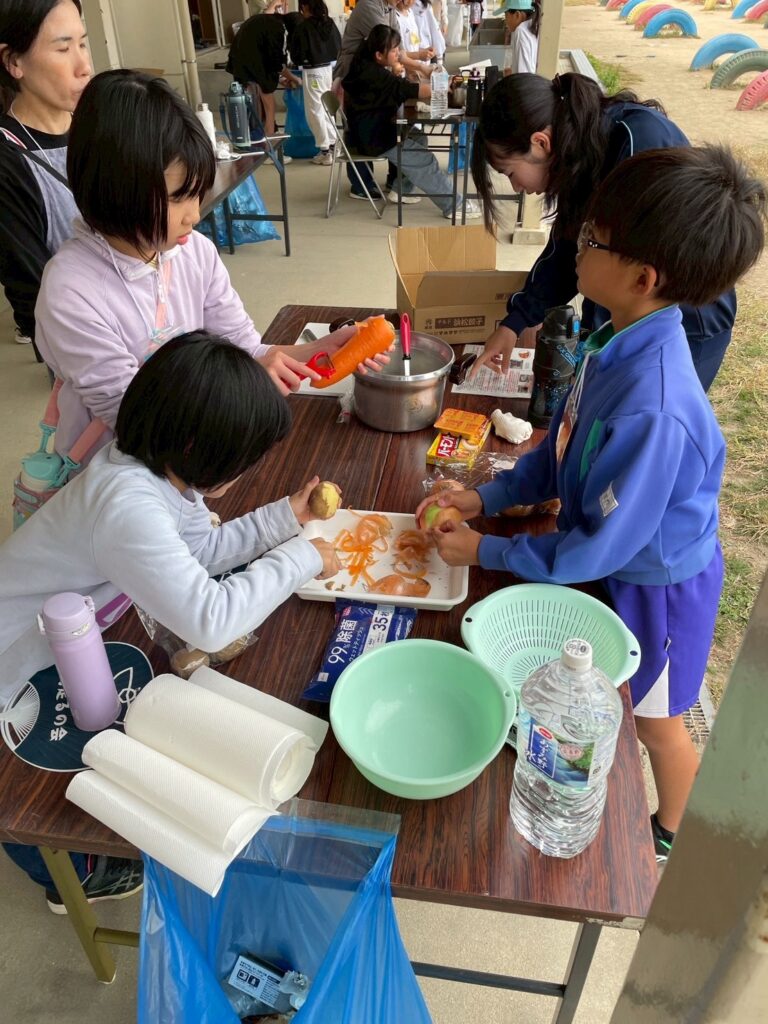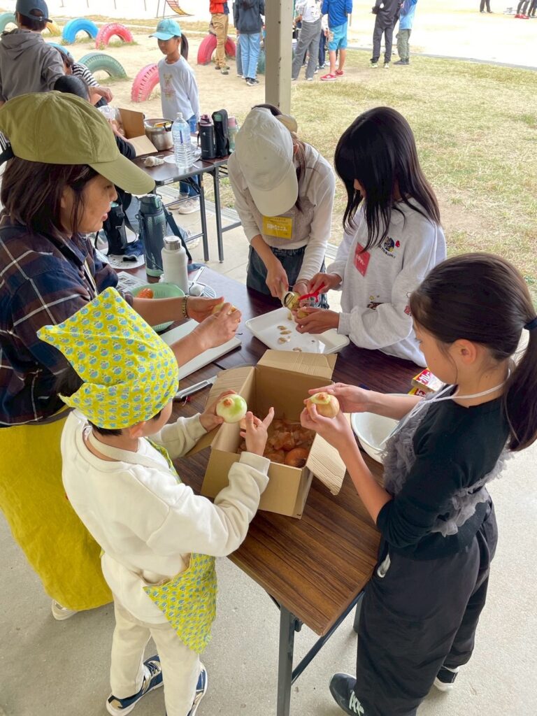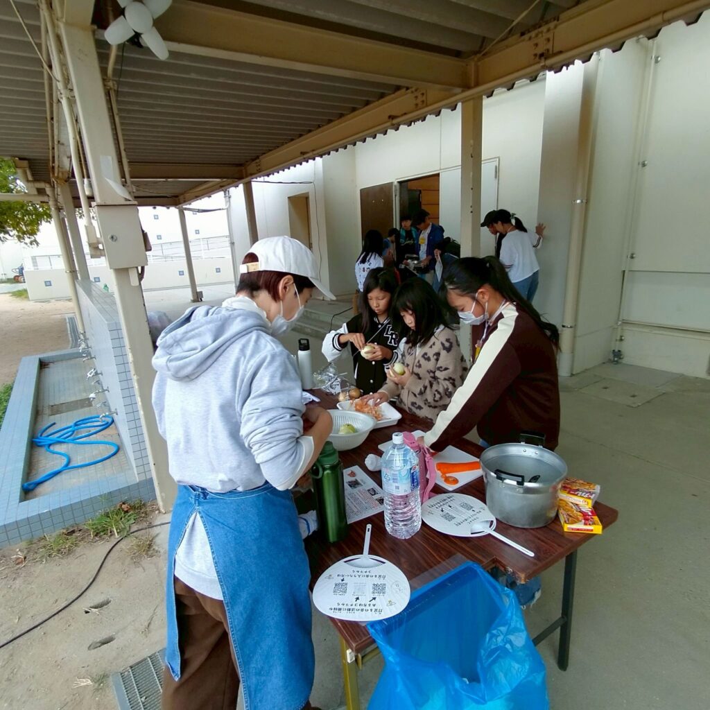 段ボールハウスが完成した後はカレー作りへ。まずはかまどチームとご飯チーム、カレーチームに分かれて集合して、灯足るの会から作り方をレクチャーしてもらってから作ります。カレーチームではなでしこの会のお母さんやキッズにも手伝ってもらいました。