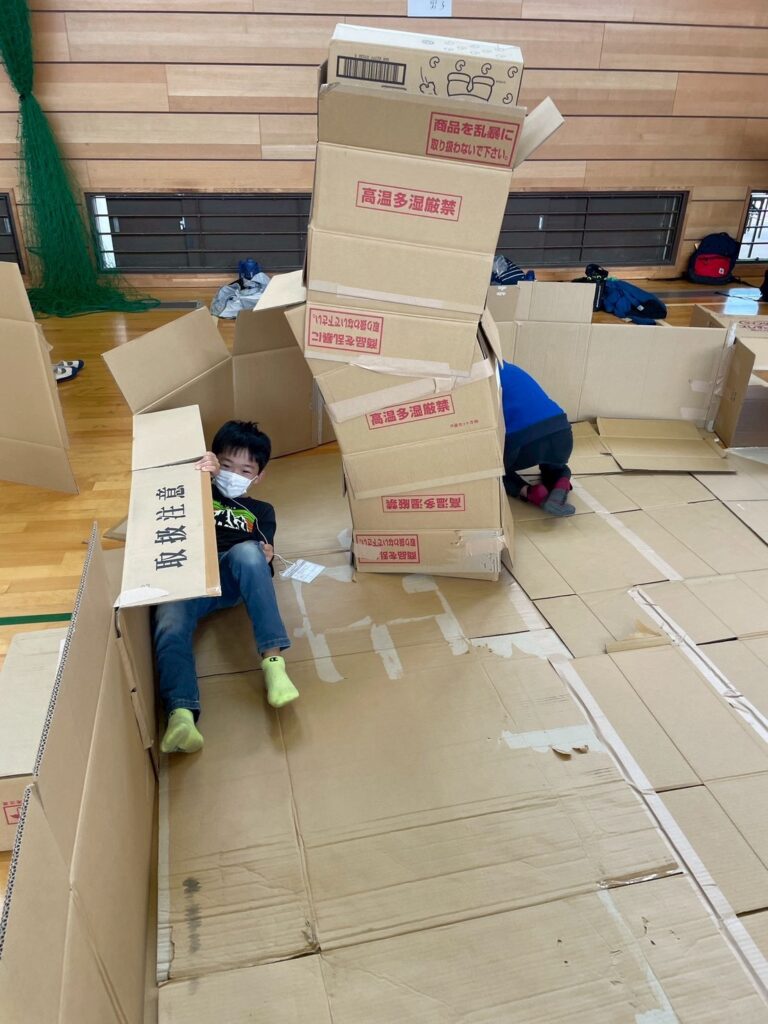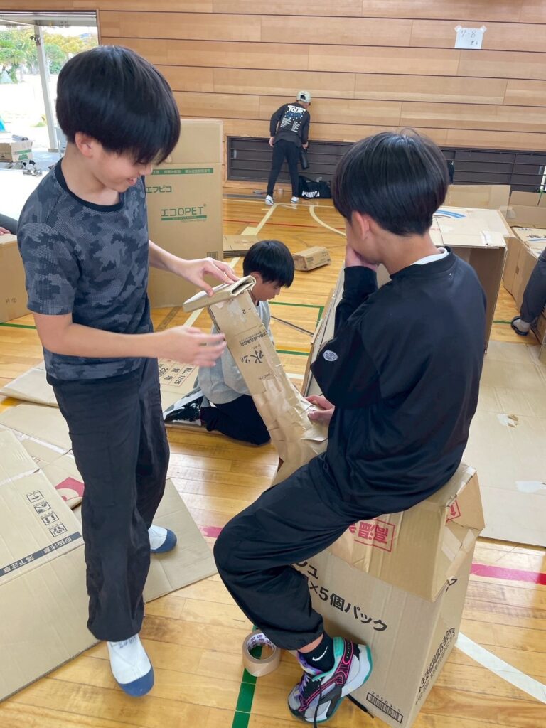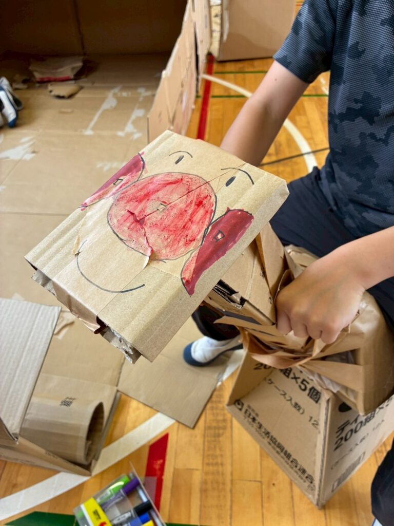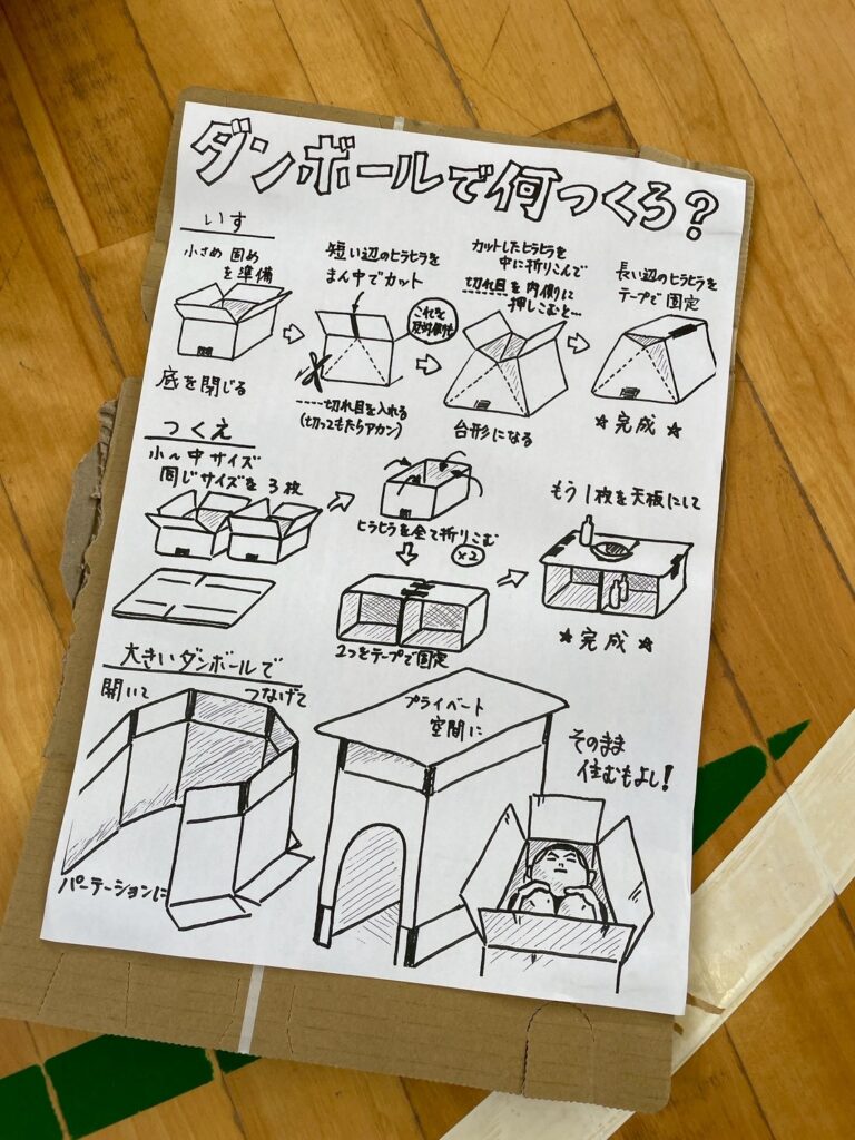 簡単な説明の後にお待ちかねの段ボールハウス作りが始まりました。みんな独創的なハウスを作成しています。