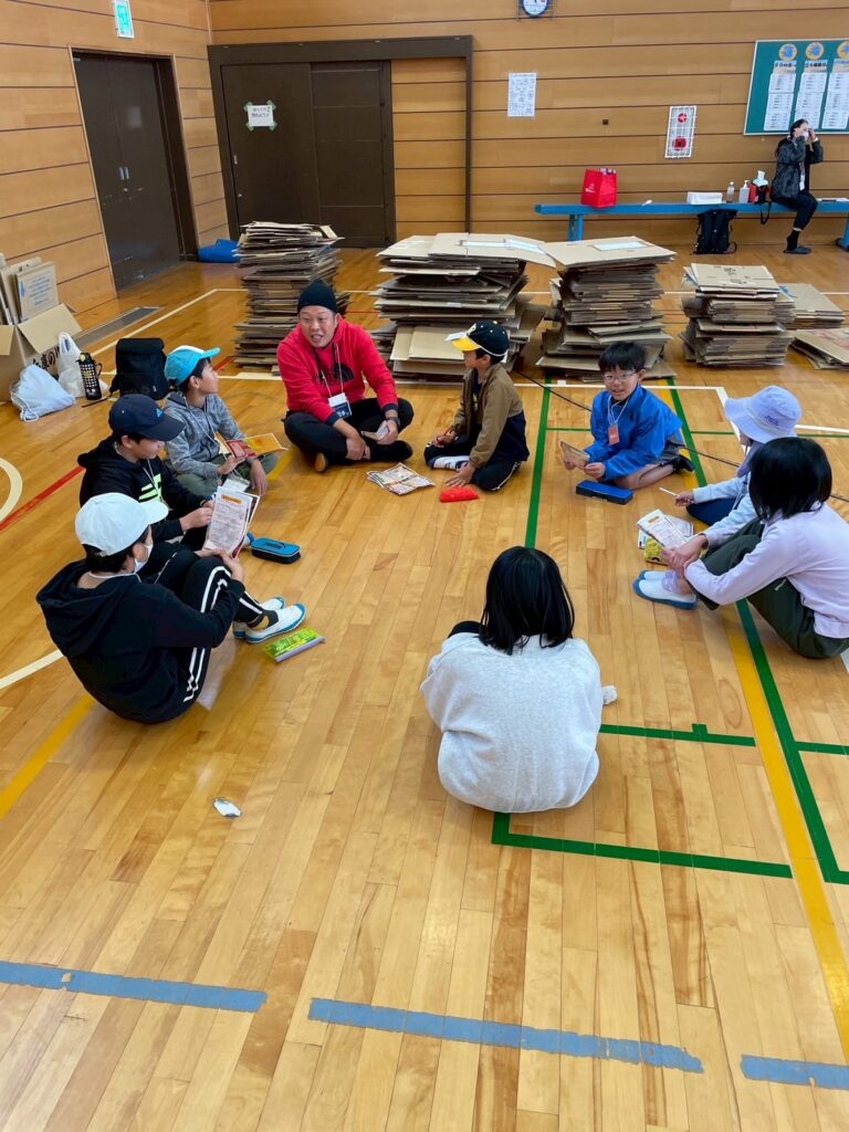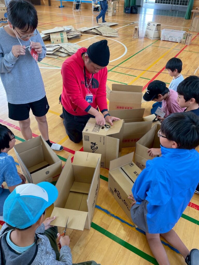 さて、引き続き、段ボールハウス作り。てっちゃんの段ボール工作教室が始まりました。