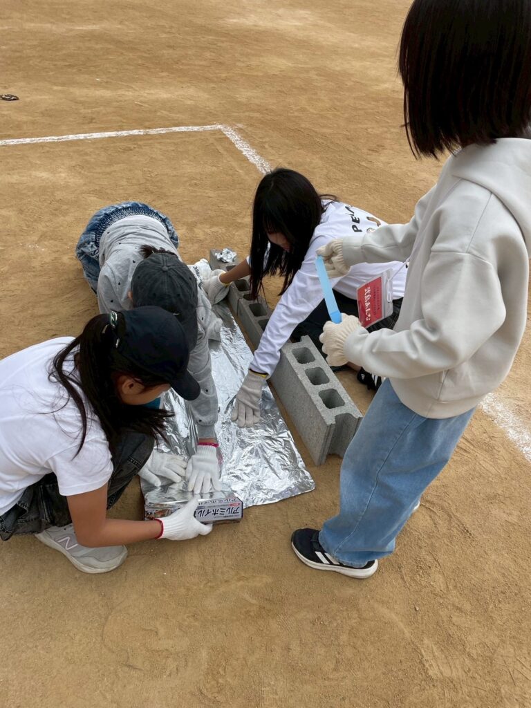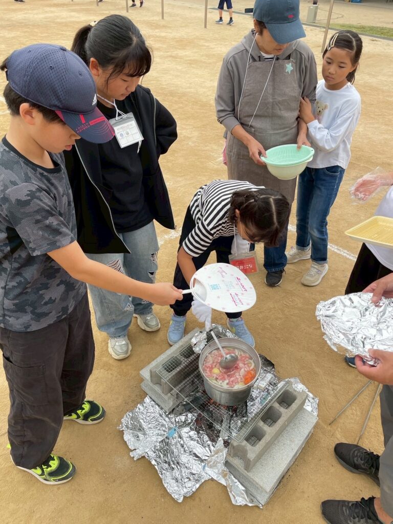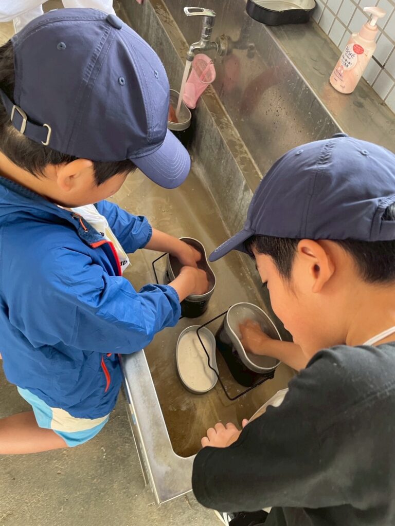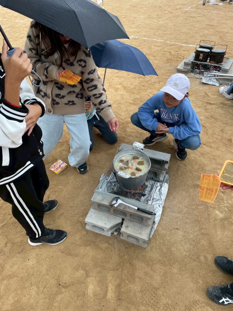 かまどをチームで作り、飯盒炊爨のお米も自分たちで水の量を測り、火起こしとそれぞれが頑張っていました。