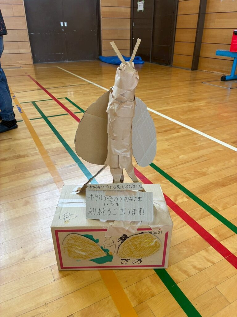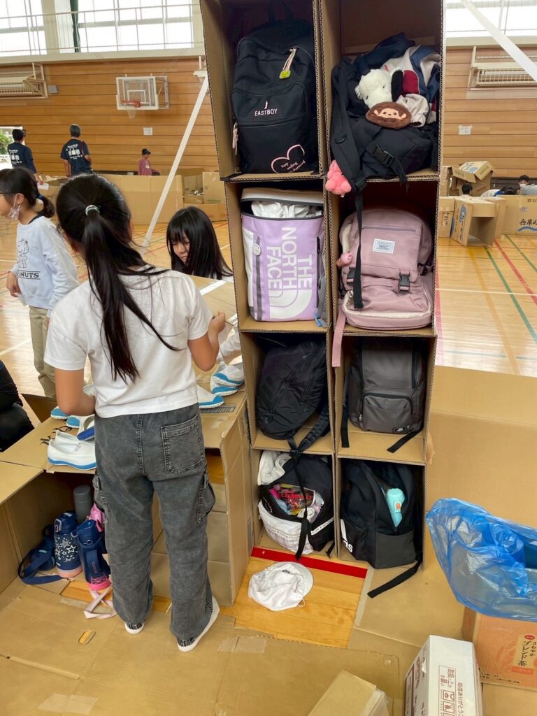 そして、防災キャンプで初の段ボールで遊具(木馬)を作る人も出現。しかも顔はアンパンマン。なんでやねん!他にも段ボールでカバン入れや灯足るの会への感謝の気持ちを表したオブジェもありました。