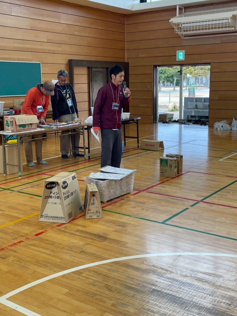 時間になって防災キャンプが始まります。まずは会長からの開始の挨拶。そして、今日一日一緒に行動する友達との自己紹介タイムです。