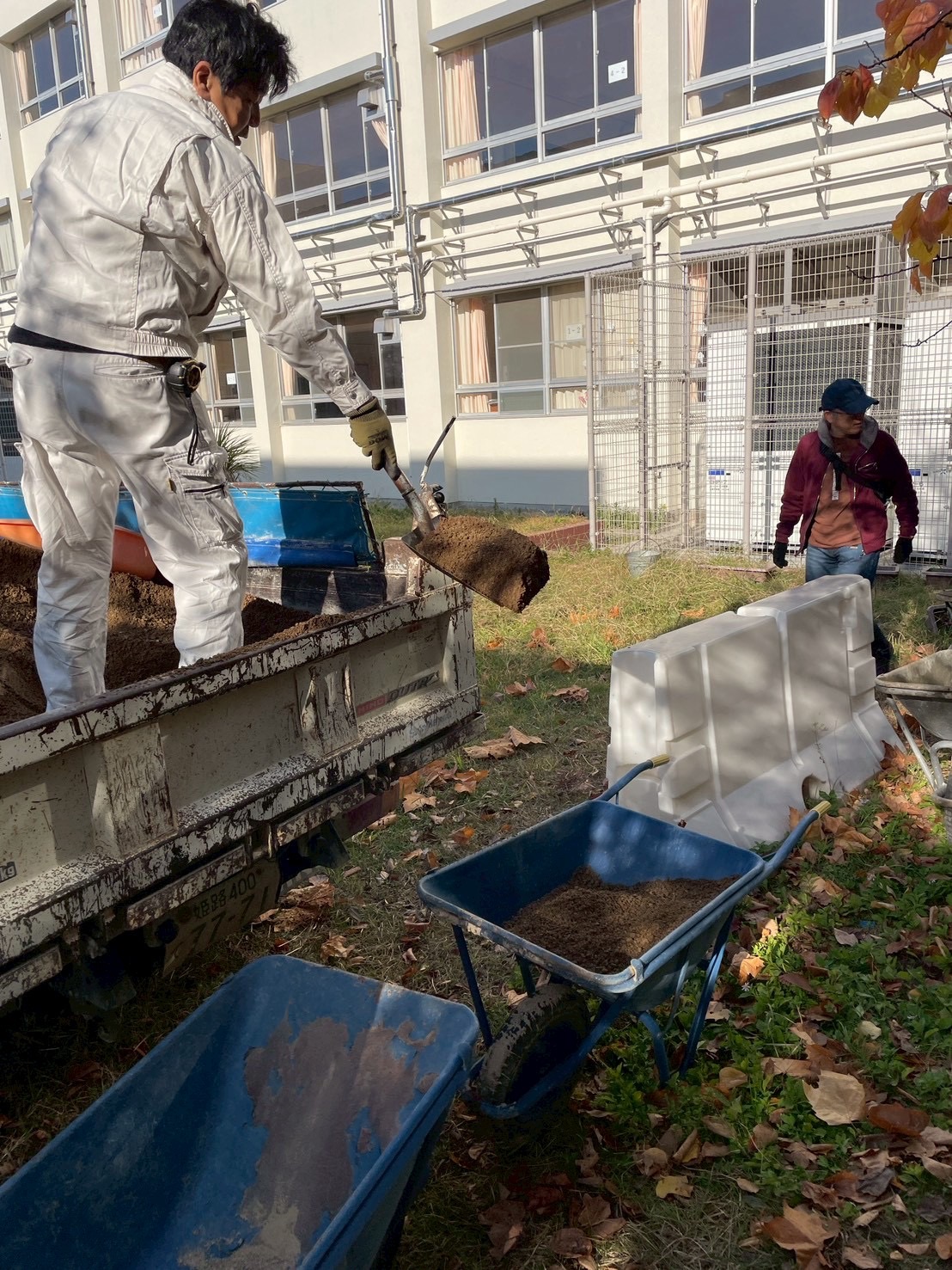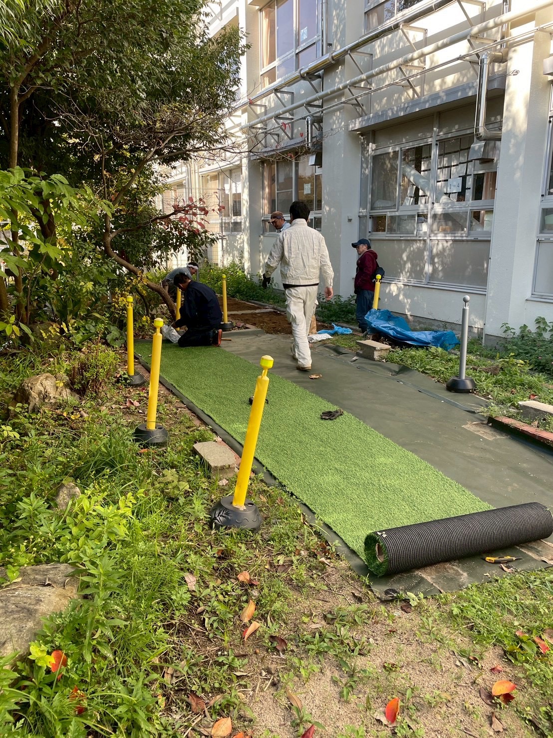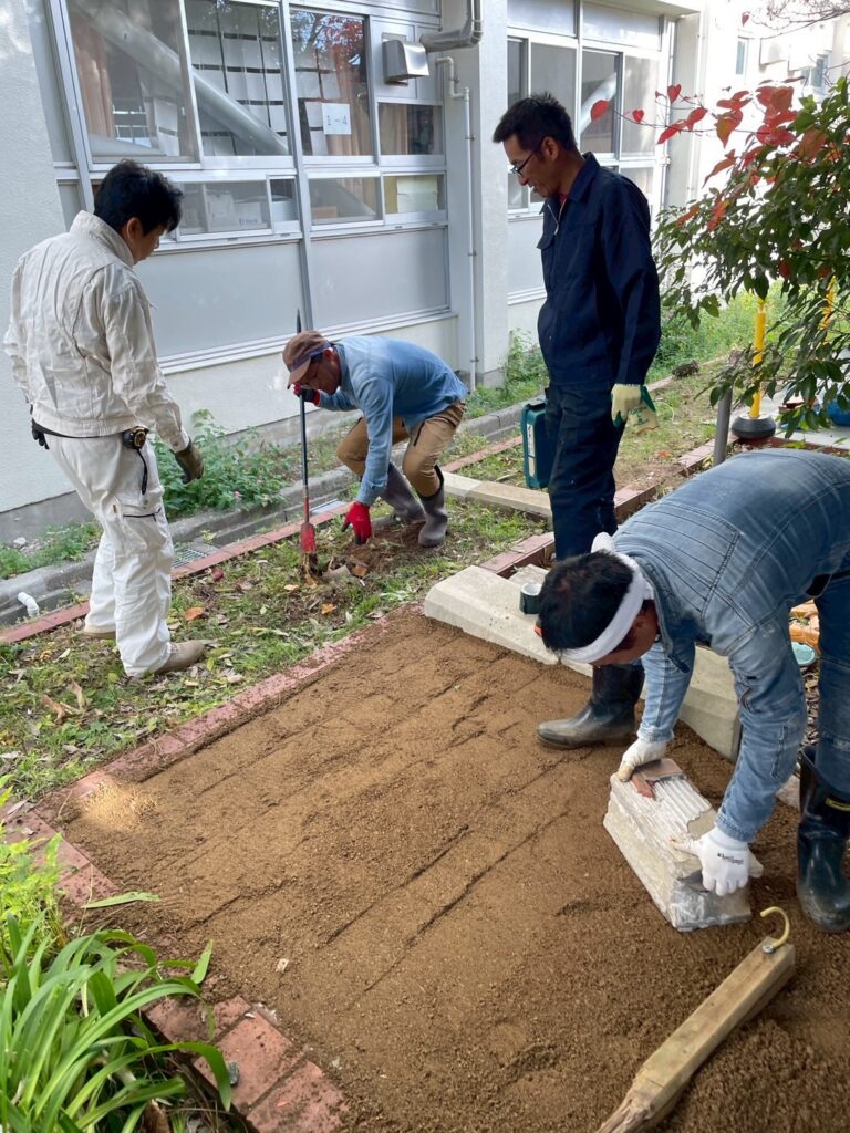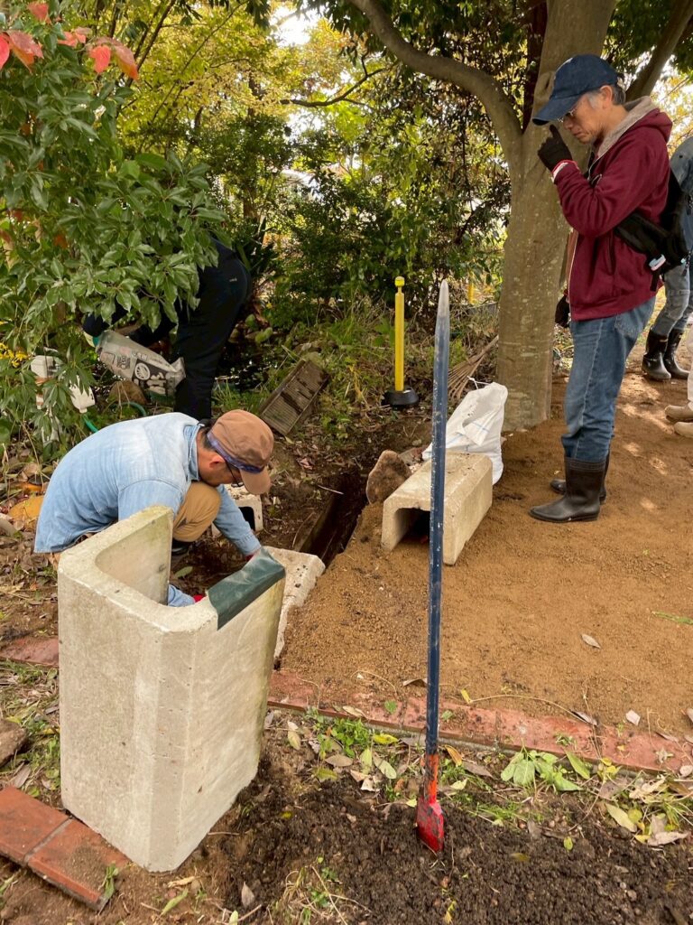 これまでは池の運動場側からしかホタルを鑑賞してもらえなかったのですが、色々な取り組みで飛翔数も増えたので、せっかくなら教室側にもグルッと回り込んで見てもらえたらな~という思い付きからスタートしたこの工事。